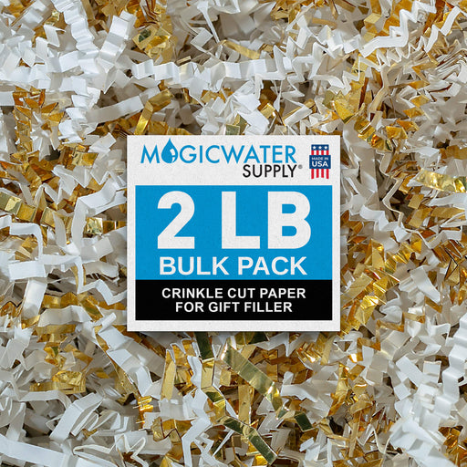 View full detailsMagicWater Crinkle Cut Paper for Gift Baskets - 2LB - White & Gold - Perfect for Shredded Paper Filler, Basket Filler, Gift Boxes, Bridesmaid Gifts, Christmas Stuffers & More - Ideal for All Occasions